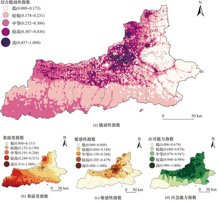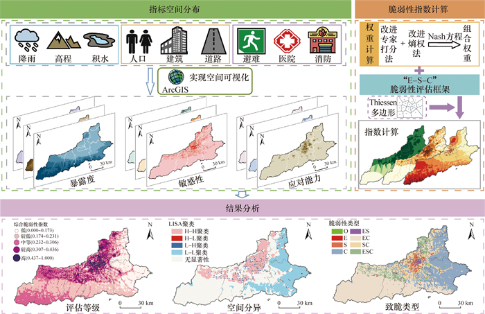 Objective: Extreme precipitation events have increased globally in recent years, leading to more frequent and intense urban flooding that seriously threatens public safety. Reliable models for assessing storm waterlogging vulnerability and studies on spatial differentiation are essential for effective disaster prevention and mitigation. However, traditional models often face two main limitations. First, traditional models frequently overlook human adaptive responses to flooding and rely on single-weight calculation methods, reducing the accuracy of their insights. Second, traditional models generally apply to larger scales, such as cities or regions, and fail to capture smaller-scale spatial differences in vulnerability. This study introduces a refined storm waterlogging vulnerability assessment model that includes exposure, sensitivity, and coping capacity. The model allows researchers to reveal the spatial clustering of storm waterlogging vulnerability in more detail, providing more in-depth insights into areas most prone to flooding. Methods: To establish a comprehensive assessment system, this study combined city-specific conditions with human adaptive responses. Nine key indicators, such as annual rainfall, were selected to capture urban-specific vulnerability. Subjective weights were assigned based on an improved expert scoring method, effectively incorporating expert insights. To enhance objectivity, the entropy method was used to calculate objective weights. Then, these subjective and objective weights were combined and optimized using the Nash equilibrium equation to achieve a balanced vulnerability evaluation. Multisource data and ArcGIS software enabled the visualization of storm waterlogging vulnerability on a 1 km grid scale in Xi'an. Global Moran's I and local indicators of spatial association (LISA) score clustering were used to analyze spatial patterns in storm waterlogging vulnerability, revealing clusters and trends across the city. In addition, a vulnerability triangle classified vulnerability levels into eight distinct types, highlighting dominant factors across regions and supporting targeted resilience planning. Results: The vulnerability assessment showed that areas with high and relatively high vulnerability to urban storm waterlogging mainly clustered in the central old city within the Third Ring Road. This area primarily consisted of various functional zones with hard-paved surfaces, dense construction, intensive development, and high population density. In contrast, areas with low and relatively low vulnerability were mainly clustered in Chang'an, Huyi, Lintong, Yanliang, Zhouzhi, and Lantian Districts, which consisted mostly of forest and agricultural lands, providing high ecological resilience. LISA clustering analysis revealed that storm waterlogging vulnerability had a clear spatial clustering pattern with a significant positive spatial correlation. Eight storm waterlogging vulnerability types are identified: strongly integrated vulnerability (ESC), sensitivity-dominated (S), exposure and sensitivity-dominated (ES), sensitivity and coping capability dominated (SC), coping capability-dominated (C), exposure and coping capability-dominated (EC), weakly integrated vulnerability (O), and exposure-dominated (E) types. The ESC type mainly appeared in the northwest and northern areas of Xi'an; the S and ES types were concentrated within the central urban area; the SC types appeared around the city center; the C types were found in the eastern regions; the EC types occupied much of the southern area of the city; and the O and E types were less common and appeared sporadically in various locations. In lower vulnerability areas, the C types were predominant. In lower to moderate vulnerability areas, the EC types were the most common. In higher vulnerability areas, the SC and ESC types were the most frequent. Conclusions: The proposed method provides a reliable scientific approach to assessing storm waterlogging vulnerability. It effectively visualizes quantitative data and identifies key factors influencing vulnerability across regions. The findings support the creation of storm waterlogging risk maps and indicate targeted disaster prevention and mitigation strategies.