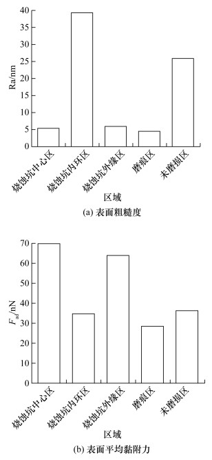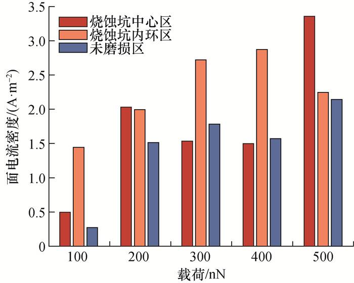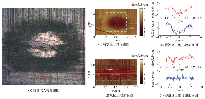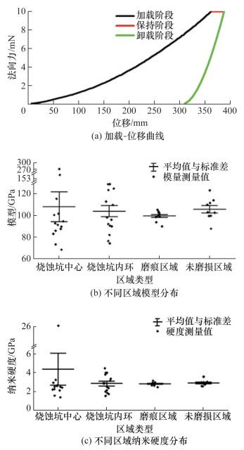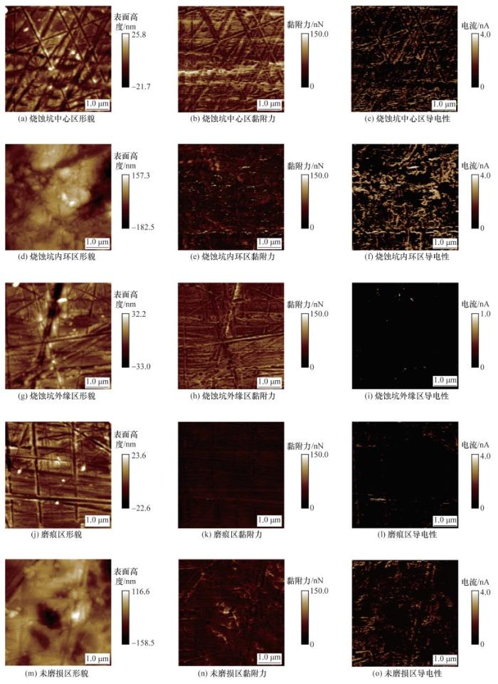Objective: Conductive slip rings, essential components in rotary electrical systems, often experience contact instability due to surface ablation because of electrical arc discharge. This study examines how the position of ablation pits influences contact stability within slip rings, highlighting their detrimental impact on electrical performance. By integrating multiscale characterization, it explores the structure, composition, and properties of ablation pits formed under operational conditions. The findings aim to deepen the understanding of their effects and identify strategies for mitigating their impact. Methods: To investigate the positional dependence of ablation pits and their impact on electrical contact stability, this study employs a comprehensive multitechnique approach. The surface topography and morphology of the ablation pits are characterized using surface profile measurements. This technique provides high-resolution data on pit depth, width, and overall surface texture. Nanoindentation tests evaluated hardness and elastic modulus variations across different pit regions within the ablation pits, identifying localized changes caused by arc discharge. Raman spectroscopy and scanning electron microscopy-energy dispersive spectroscopy (SEM-EDS) analyses examined the chemical and structural alterations within the pits. Raman spectroscopy detected molecular-level alterations, such as the presence of graphitic or disordered carbon, whereas SEM-EDS offered data on elemental compositions. Conductive atomic force microscopy (C-AFM) measured electrical conductivity variations across different pit regions, linking material changes to the slip ring performance. By combining these techniques, the study provides a thorough examination of the effects of ablation on the mechanical, chemical, and electrical properties of the slip ring material. Results: The results demonstrate a clear positional dependence of the ablation pit characteristics, with significant variations in morphology and material properties across different regions. Surface profiling showed that pits in the central area were deeper and more defined than the outer regions that appeared shallower. Nanoindentation results indicated high hardness and elastic modulus in the pit center and inner ring regions, suggesting localized transformation of the material owing to high-temperature arc discharge. Conversely, the outer regions exhibited low hardness, indicative of extensive material degradation. Raman spectroscopy results highlighted the presence of disordered and graphitic carbon deposits in the inner and central regions of the pits, further contributing to high local conductivity. These findings were supported by C-AFM measurements, which confirmed considerably increased conductivity in the central and inner regions owing to carbonaceous deposits formed during the discharge process. Finally, SEM-EDS analysis reveals compositional gradients within the pits, with high concentrations of carbon and oxygen near the center and copper depletion toward the edges, suggesting complex interactions between copper, carbon, and oxygen during ablation. Conclusions: Ablation pits introduce mechanical and electrical heterogeneities, remarkably influencing contact stability. The positional differences in pit properties are directly linked to the arc discharge process, driving localized surface modifications and material transformations. The study highlights the complex interplay among mechanical properties, electrical conductivity, and material composition within the ablation pits, offering valuable insights into the mechanisms underlying contact instability in conductive slip rings. The results improve the understanding of surface ablation and inform material design and operational strategies for mitigating its adverse effects. Addressing the challenges posed by ablation pits plays a key role in advancing the performance and reliability of conductive slip rings in demanding, high-performance applications.