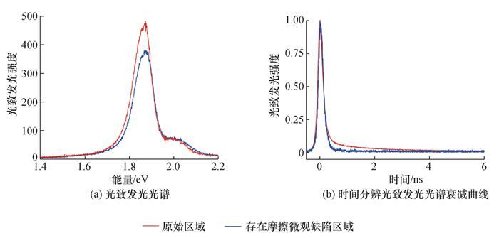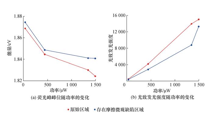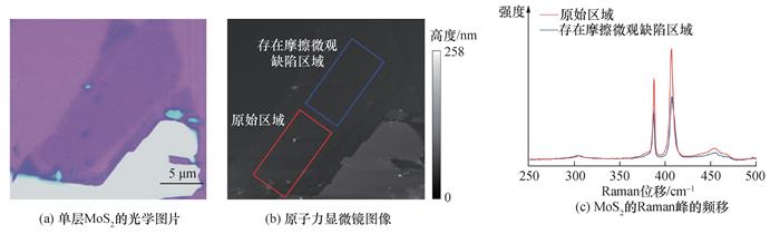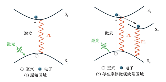 Objective: The rapid evolution of the high-end equipment manufacturing industry, from traditional manual Methods to advanced digital intelligent manufacturing, has significantly improved production precision and contributed to technological advancements across various sectors. As the demand for the reliability and durability of critical components in aerospace, semiconductor manufacturing, and other industries continues to rise, there is an increasing focus on understanding microscale defects caused by friction. These friction-induced microdefects, including microcracks and phase transitions, present significant challenges. Although these defects are often subtle and not easily observed under standard conditions, their cumulative effects can significantly impact material performance. Currently, systematic investigations into the influence of friction-induced defects on the optical properties of semiconducting materials remain limited. Methods: This research addresses this gap by focusing on monolayer molybdenum disulfide (MoS2), a widely studied two-dimensional (2D) material known for its exceptional electronic and optical properties. Monolayer MoS2 samples, free of defects, were prepared through the mechanical exfoliation method. Microscale friction-induced defects were introduced via atomic force microscopy under controlled loading conditions to ensure reproducibility and minimize significant structural damage. After defect introduction, the optical properties were analyzed via photoluminescence (PL) spectroscopy and Raman microscopy. Results: The experimental results showed that friction-induced defects generated new defect energy levels within the MoS2 structure. These defect states served as non-radiative recombination centers, leading to a substantial reduction in PL intensity and exciton lifetime. Steady-state PL measurements showed a significant decrease in fluorescence intensity in defect-affected regions compared with pristine regions. Time-resolved PL spectroscopy further quantified the reduction in exciton lifetime, from 0.198 ns in pristine regions to 0.128 ns in defected regions, confirming that defects introduced non-radiative dissipation channels for excitons. Raman spectroscopic analysis confirmed the structural integrity of the samples after friction, with observable shifts in vibrational modes indicating the presence of localized stress fields and defect-induced modifications. Temperature-dependent PL studies highlighted the pronounced impact of friction defects at low temperatures. As the temperature decreased, defect-induced PL peaks became dominant in the spectral profile, particularly below 60 K; this behavior is attributed to the enhanced capture of excitons by defect states owing to reduced thermal activation at lower temperatures. Moreover, the defect-induced spectral features became more prominent with higher excitation powers, highlighting the influence of the features on carrier dynamics and non-radiative recombination pathways. These results emphasize the critical role of defect management in optimizing the performance of MoS2-based optoelectronic devices. Conclusions: The presence of friction-induced defects not only reduces PL efficiency but also shortens exciton lifetimes, posing challenges for applications that require high quantum yield and stable emission properties. Therefore, strategies to mitigate defect formation during manufacturing and operational processes are crucial for improving device reliability and efficiency. This study elucidates the physical mechanisms driving defect-induced alterations in the optical properties of 2D materials, offering a foundation for improved material design and device engineering. Future research will focus on extending these findings to other 2D materials, such as WS2 and BN, and incorporating advanced characterization techniques, such as electron microscopy and first-principles calculations, to investigate defect formation at the atomic scale. By addressing these challenges, this research plays a key role in advancing the development of next-generation, high-performance optoelectronic devices suited for demanding industrial applications.