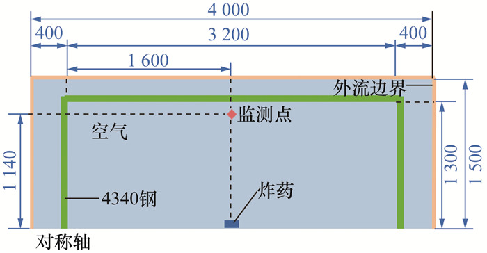 [15]通过对温压炸药与TNT坑道堵口爆炸进行数值计算,发现温压炸药的超压峰值和正相冲量平均为TNT的1.91和1.82倍,分别为空旷地面的13.55和15.21倍,证明了坑道对温压炸药冲击波的约束作用。