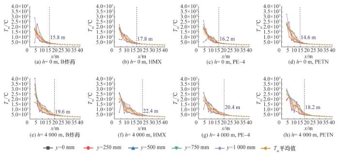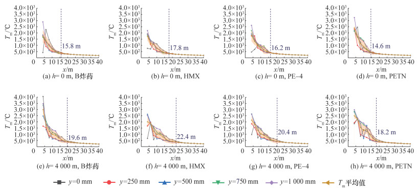 [9-10]通过不同炸药量三硝基甲苯(TNT)与温压炸药的长直坑道内爆试验,发现在相同爆心距处的温度峰值之比与持续时间之比均近似等于炸药质量的立方根之比。不同类型炸药在坑道内爆炸的研究也积累了大量成果。张洪铭等