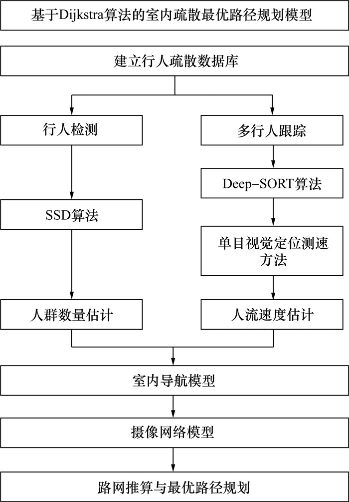 Objective: This study aimed to enhance the efficiency of indoor evacuation procedures by developing an optimal path-planning model based on the Dijkstra algorithm. The primary goal was to provide a dynamic and intelligent solution for guiding individuals to exit safely and swiftly during emergencies. Considering the complexities of indoor environments and the unpredictability of crowd behavior, the study highlighted the urgent need for a path-planning decision model that can adapt to real-time changes in crowd density and pedestrian flow velocity. Methods: This study employed the single shot detector (SSD) algorithm for person detection and the deep learning-based simple online and real-time tracking (Deep-SORT) algorithm for multi-pedestrian tracking. These approaches, integrated with monocular vision techniques, enabled the extraction of pedestrian counts and flow velocities from architectural surveillance video streams. The Industry Foundation Classes standard was utilized to extract detailed architectural spatial information required for constructing a path network tailored for evacuation purposes. A novel method for predictive edge setting within the existing camera surveillance network was then introduced, allowing for the calculation of residual predictive edge pedestrian flow velocities. This calculation informed the development of an edge weight calculation method for the navigation road network, which is crucial for optimizing evacuation routes. These calculated weights were input into the Dijkstra algorithm to identify the shortest-time evacuation routes from any given node to the nearest exit. Results: The proposed model was validated through experiments conducted using a proprietary pedestrian database under simulated emergency conditions. The SSD algorithm achieved an average precision of 78.2% for pedestrian detection and counting, while the Deep-SORT algorithm achieved multiple object tracking precision and multiple object tracking accuracy scores of 71.2% and 78.5%, respectively. These metrics demonstrate the model's high accuracy in detecting and tracking pedestrians, a crucial aspect of effective evacuation planning. In addition, the model provided optimal path directions at each decision node, allowing for real-time adjustments as conditions change. Moreover, the system could adapt to fluctuating crowd dynamics, a critical feature given the unpredictable nature of human movement during emergencies. Conclusions: This study demonstrated the feasibility of implementing a Dijkstra algorithm-based optimal path-planning model for indoor evacuations, achieving efficient and intelligent route optimization. The research provides a solid theoretical foundation and practical technical support for managing complex indoor evacuation scenarios, thereby contributing to the fields of emergency management and crowd control strategies. Further refinement and application of this model in real-world settings are expected to substantially enhance public safety measures. Additionally, the model's potential integration into existing building management systems presents a promising avenue for improving safety protocols and fostering a more systematic approach to handling indoor evacuations.