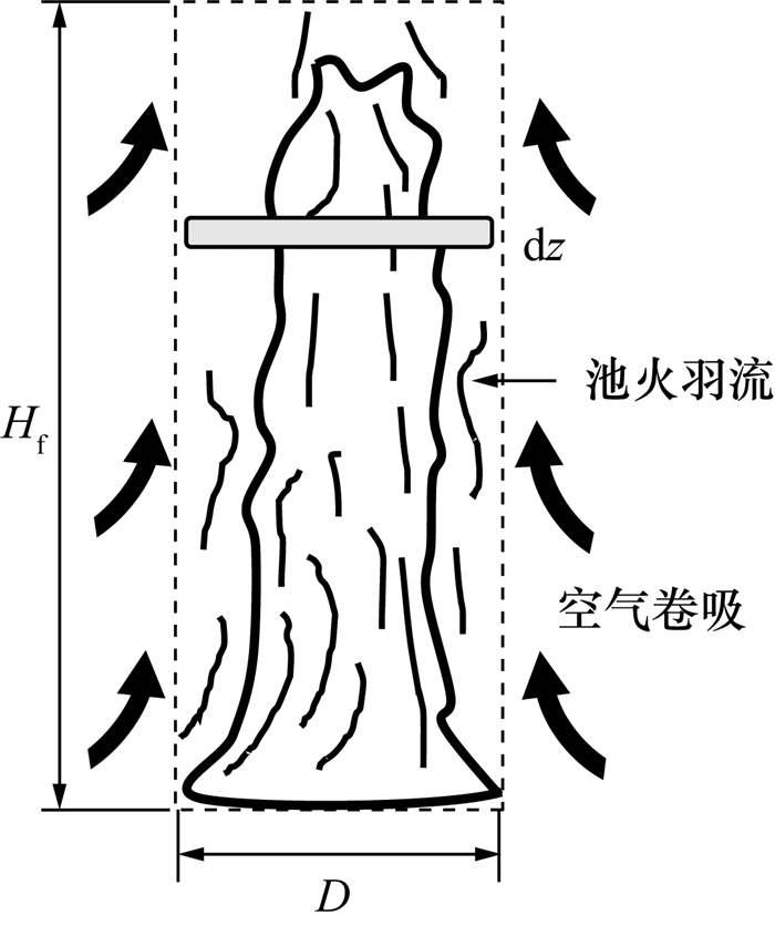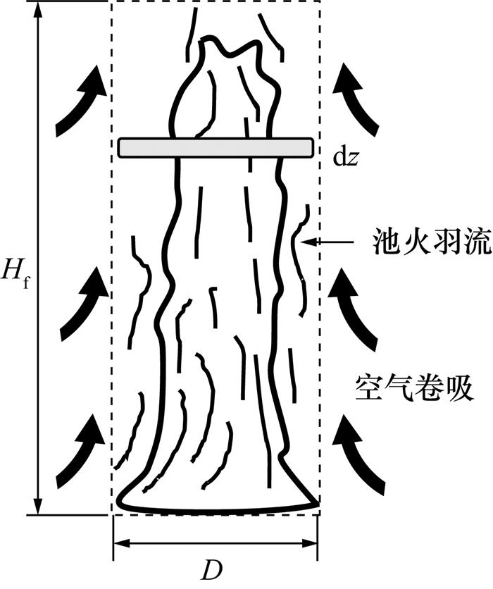[9]开展了不同边长(30、40 cm)的矩形油池火薄层航空煤油实验,通过对比不同火焰模型发现模型预测值小于实际测量值,其中不均匀的卷吸是导致火焰偏高的原因。蒋新生等