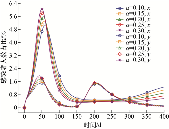 | γIx | 0.07 | 病毒性呼吸道传染病的有症状感染者平均自愈时间约为3~21 d,γIx=1/(有症状感染者平均自愈时间/d),取0.07 |