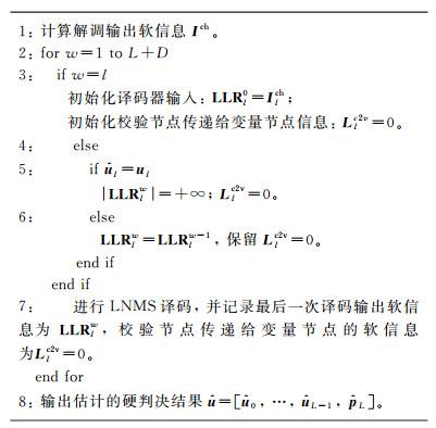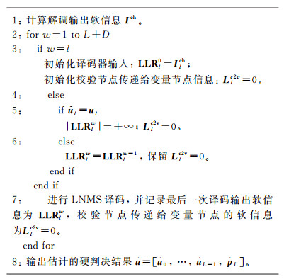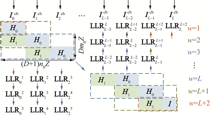 17]提出的最小错误渐进边生长(error minimization, EM)PEG算法在边连接过程中综合考虑了短环结构及其外部校验节点度数(extrinsic message degree, EMD)等因素,从而进一步优化误码性能。在译码方面,SC-LDPC码直接采用置信传播(belief propagation, BP)译码算法,随着码长的增加,计算复杂度呈指数增长。由于SC-LDPC码特殊的耦合方式,采用SWD译码算法可以有效地降低译码复杂度和时延