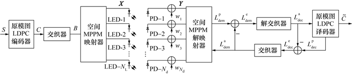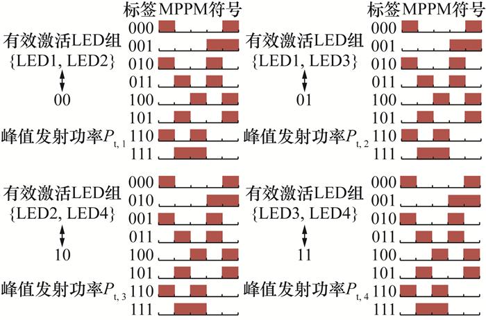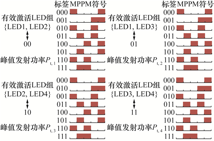 [14-15]。传统MIMO技术通过在每个符号传输瞬间激活所有的LED发射器进行信息传输,会导致信道间干扰(inter-channel interference, ICI)。为了避免ICI,在文[