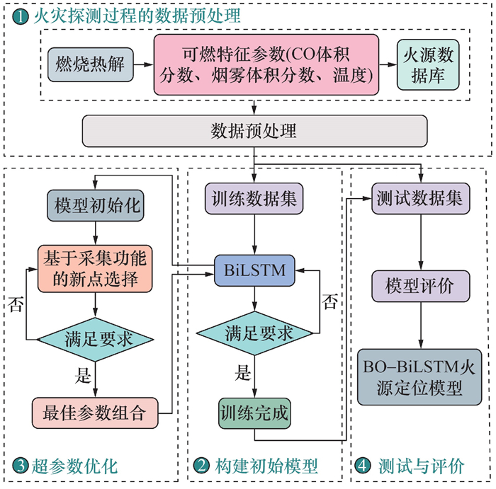 [15]提出CNN-BiLSTM的新型深度学习模型,用于实时预测野火蔓延,并捕获其时空变化特征。以上研究表明使用BiLSTM模型进行火灾探测具有良好的性能。神经网络的损失函数往往是非凸的,存在多个局部最小值,难以找到全局最优解。为了解决这一问题,Bayes优化算法作为一种有效的全局优化算法,被广泛应用于超参数调整,提高了寻找最优解的概率
