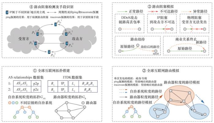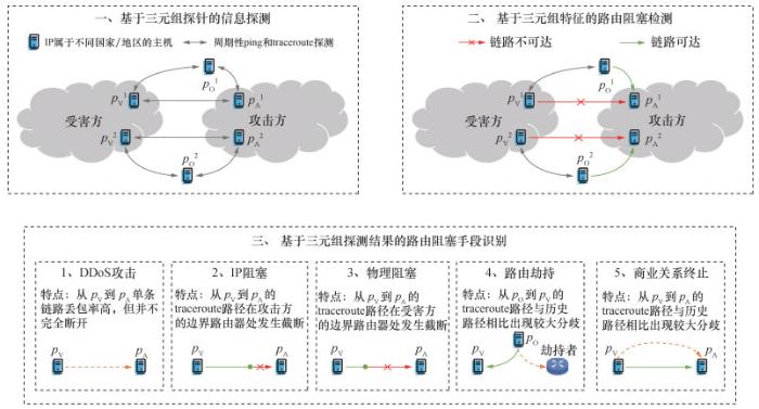 在路由威胁的攻击与检测方面,除了路由阻塞之外,常见的路由威胁可以分为3种:源劫持、路径劫持和路由泄露。Birge-Lee等