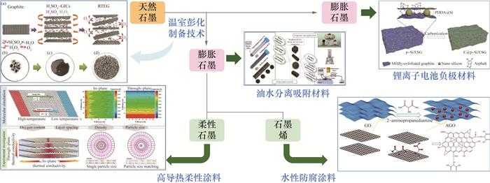 Significance: Natural graphite, a cornerstone of China's strategic mineral resources, enables the country to leverage its exceptional geological endowments and industrial prowess to maintain unparalleled global leadership. China's natural graphite industry dominates in both production output and high-value deep-processed products, such as spherical graphite and exfoliated graphite, positioning the country as a key strategic fulcrum in carbon materials competitiveness. Natural graphite, a thermodynamically stable crystalline allotrope of carbon, exhibits a hexagonal lattice structure in which sp2-hybridized carbon layers are stacked via weak van der Waals interactions. This intrinsic lamellar architecture underlies its unique material properties: high electrical and thermal conductivity, resistance to high and low temperatures, low friction coefficient, thermal stability, chemical inertness, and biocompatibility. Natural graphite is an irreplaceable foundational material that bridges traditional manufacturing with cutting-edge strategic emerging industries through its synergistic properties. In traditional industrial sectors, natural graphite demonstrates versatile applicability: in metallurgy, it functions as a carburetant and high-temperature refractory material; in mechanical engineering, its self-lubricating properties enable the fabrication of wear-resistant components such as precision bearings and seals; and in chemical processing, it can be modified through intercalation to create catalyst supports and advanced adsorption materials. Within strategic emerging industries, the strategic value of natural graphite is further elevated: high-purity spherical graphite acts as an irreplaceable precursor for lithium-ion battery anode materials, exfoliated graphite provides efficient oil-water separation, and flexible graphite is the material of choice for sealing systems operating under harsh environmental conditions. Progress: Recent advances in the exfoliation of graphite at room temperature have enabled the use of milder reaction conditions that better preserve its crystal structure. Unlike high-temperature processes, this method prevents local oxidation, resulting in exfoliated graphite worms with high flexibility. Room-temperature exfoliation can produce exfoliated graphite blocks with controllable shape, density, high mechanical strength, and excellent rebound. Electrochemically exfoliated graphene has few layers and a high yield, making it highly effective in enhancing the anti-corrosion performance of water-based coatings. Meanwhile, flexible graphite paper prepared by rolling has high electrical and thermal conductivity. Micro exfoliated graphite modified via room-temperature exfoliation can be combined with other metals to form lithium-ion battery anode materials with excellent rate performance and cycle stability. To address the growing demands for functional exfoliation and performance enhancement of natural graphite, this study systematically reviewed the latest research progress in six key categories: graphite intercalation compounds, natural graphite anode materials, exfoliated graphite, flexible graphite, graphene powder, and microcrystalline graphite-based isotropic graphite. The study systematically integrated research across the technological chain, including material synthesis, structural modulation, performance optimization, and industrial-scale application. Moreover, the intrinsic structure-activity relationships and critical technical bottlenecks in natural graphite-based materials were identified. Conclusions and Prospects: Natural graphite-based materials are poised to evolve toward higher performance, greener processes, and multifunctionality, serving as a key material for strategic emerging industries. This study provides a comprehensive reference for further research and industrial applications of natural graphite-based materials.