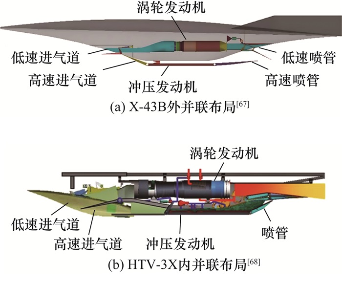 | 内并联布局方式 | HTV-3X飞行器内并联布局进气道 | 结构紧凑,外部阻力小 | 变几何调节规律较复杂,易产生进气耦合干涉效应 | |