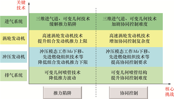 | 进发匹配控制技术 | NASA的CCE-LIMX项目 | 发动机总体性能较好,推力过渡平稳 | 宽速域快速动态调控难度较大,控制系统复杂 | |