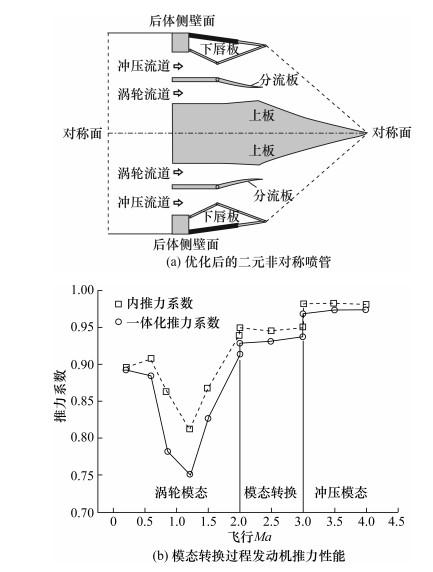 | 二元式喷管构型 | X-43A、X-51A飞行器 | 结构简单,易于调节,设计难度较低 | 与燃烧室和飞行器尾体集成难度大 | |