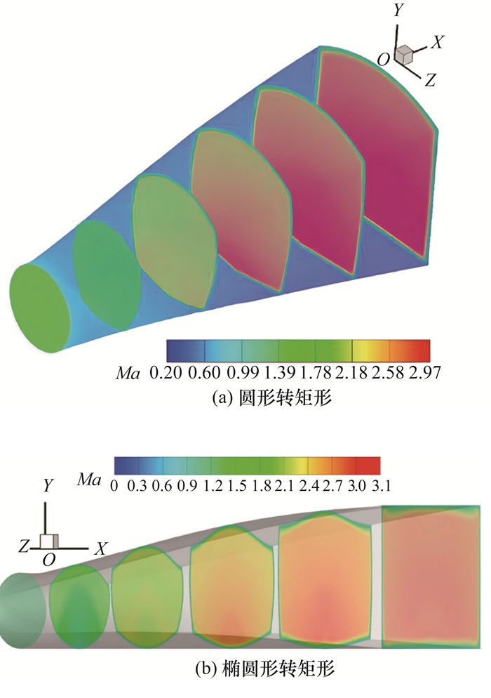 | 三维内转式进气道构型 | HTV-3X和SR-72飞行器进气道 | 结构紧凑,压缩效率高,来流捕获能力较强;相比二元式进气道,推力增益达24.87% | 构型设计难度大,内流场三维弯曲激波系统复杂 | |