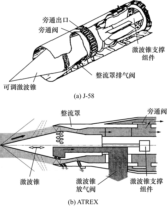 | 轴对称式进气道构型 | J-58和ATREX发动机进气道 | 结构简单且便于调节,设计制造难度低 | 宽速域组合通道气动性能不足,可调节裕度小 | |