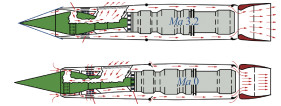 | 外并联布局方式 | X-43B飞行器外并联布局进气道 | 设计难度小,变几何调节难度低 | 外部阻力大且占用飞行器体积较大;高动态负载下,整流罩关闭后难以重新开启 | |