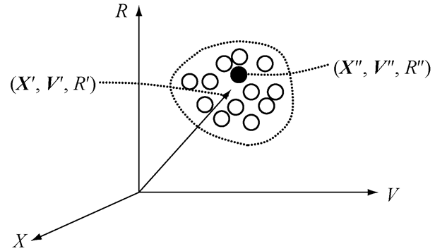 特征液滴的物理意义为: 在相空间点( X', V', R')附近的液滴,如果它们的位置、速度和半径可用平均值( X″, V″, R″)表示,那么具有( X″, V″, R″)值的液滴称为特征液滴。如果将相空间用坐标表示(图1), 空心圆圈代表( X', V', R' )附近的液滴,实心圆圈就代表特征液滴,它位于相空间( X″, V″, R″)点处。选取特征液滴不仅能够离散NDF, 而且可以减少用Lagrange法跟踪液滴的个数,达到降低计算量的目的。