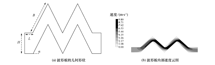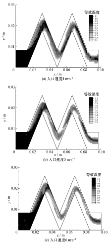 利用 Ansys13 Fluent对波形板内气相流场进行模拟,流动设置为稳态,入口速度分别设为4、 5、6 m/s, 粘性模式选用标准κ-ε湍流模型,固壁设置为无滑移边界,出口设置为压力边界,选用 SIMPLE算法求解,压力项离散格式为 Standard, 其余各项离散格式为二阶迎风,各项残差设置为10-5。当w=3及入口速度为4 m/s时,计算结果(网格独立解)采用 Ansys13 CFD-Post处理得到的波形板内流场的速度云图(图2 b)。