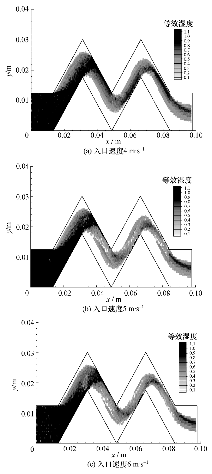 其中β'm表示经变换后得到网格内的等效湿度值。易知β'm与βm正相关,即β'm的值越大表明βm的值越大,反之亦然。由图4和图5可见,在波形板入口附近,液滴的湿度较高。液滴随着流场经过波形板第一级后,液滴湿度降低,而壁面上湿度增加(图中深色区域), 说明有大量液滴沉积在壁面处,表明此处有大量液滴被波形板分离。随着液滴和气体向出口进一步运动,液滴的湿度逐渐降低,部分壁面的湿度渐渐增加,说明此时有一部分液滴被波形板分离。在第二级波形板的后半段直至波形板的出口,流场中液滴湿度的变化不再明显,说明此时液滴可直接流出波形板。