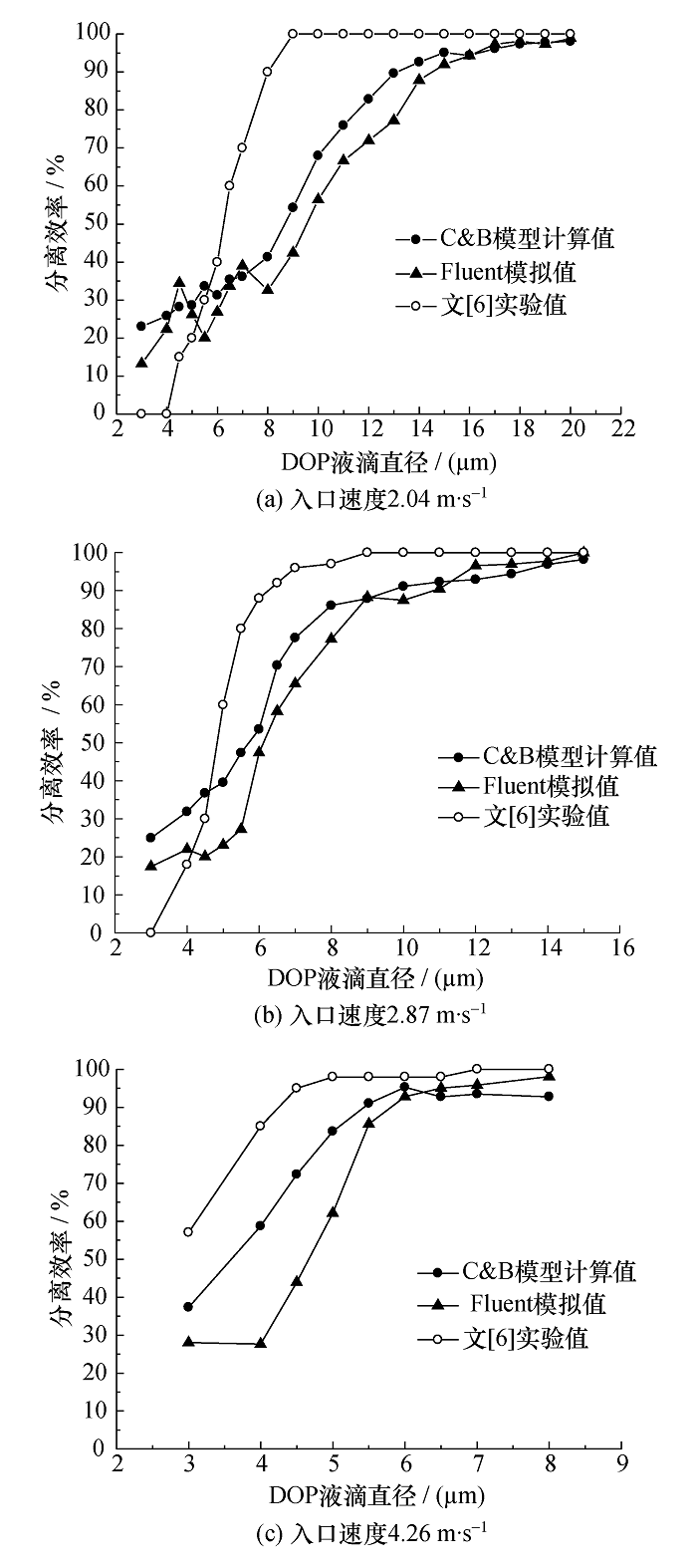 图7给出了不同直径的DOP液滴在旋风分离器的分离效率。图7a中,对直径小于8μm的液滴, Fluent的计算结果出现震荡; 而从C&B模型的计算结果看出,随液滴直径的增大,分离效率增大,这与实验值变化的趋势相符。对直径在8μm至16μm范围内的液滴, C&B模型的计算值较Fluent更加趋近实验值。对于直径大于16μm的液滴, C&B模型的结果和Fluent几乎一致,且与实验值的相对误差均在10%以内。图7b中,对直径小于 5μm 的液滴, Fluent的计算结果出现震荡; 而C&B模型的计算结果与实验值的变化趋势相符。对直径在5μm至11μm范围内的液滴, C&B模型的计算值较Fluent更加趋近实验值。对于直径大于11μm的液滴, C&B模型的结果和Fluent的相对误差在4%以内,且与实验值的相对误差均在10%以内。图7c中,对直径小于4μm的液滴, Fluent的计算结果不变; 而C&B模型的计算结果与实验值的变化趋势相符。对直径在4μm至6μm范围内的液滴, C&B模型的计算值较Fluent更加趋近实验值。对于直径大于11μm的液滴, C&B模型的结果和Fluent的相对误差在5%以内,且与实验值的相对误差均在10%以内。从总体上看, C&B模型的计算结果和Fluent接近,且对较小直径范围内的液滴, C&B模型计算结果更加趋近实验值。对较大直径的液滴, C&B模型和Fluent的计算结果相差较小,其相对误差在5%以内。这是由于大直径液滴主要受曳力的影响,此时C&B模型和Fluent中液滴运动方程基本相同,而C&B模型采用算子分裂算法或经典Runge-Kutta算法对其求解,而Fluent采用梯形或隐式格式求解[17]; 同时本文采用距离反比权重插值获得液滴位置处流场信息[14],而目前尚无公开文献给出Fluent中的插值方式,以上这些因素都会导致大直径液滴的模拟结果的差异性。基于以上论述,可验证C&B模型的正确性。