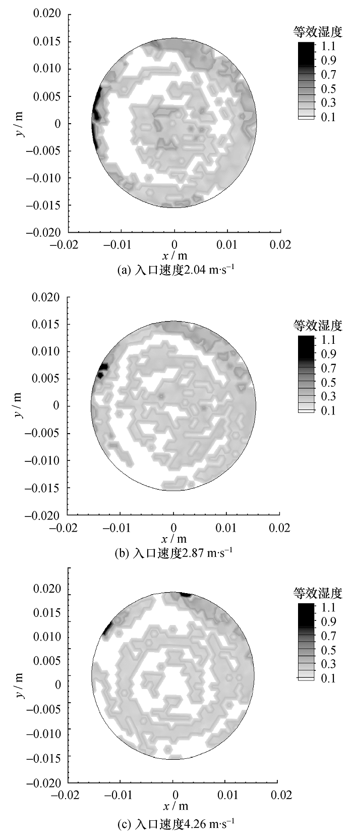 C&B模型可以给出DOP液滴在旋风分离器各个截面上的湿度分布。现给出观测截面(观测截面的位置见图6)上DOP液滴等效湿度分布见图8,等效湿度定义见式(36)。