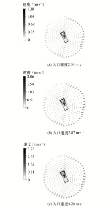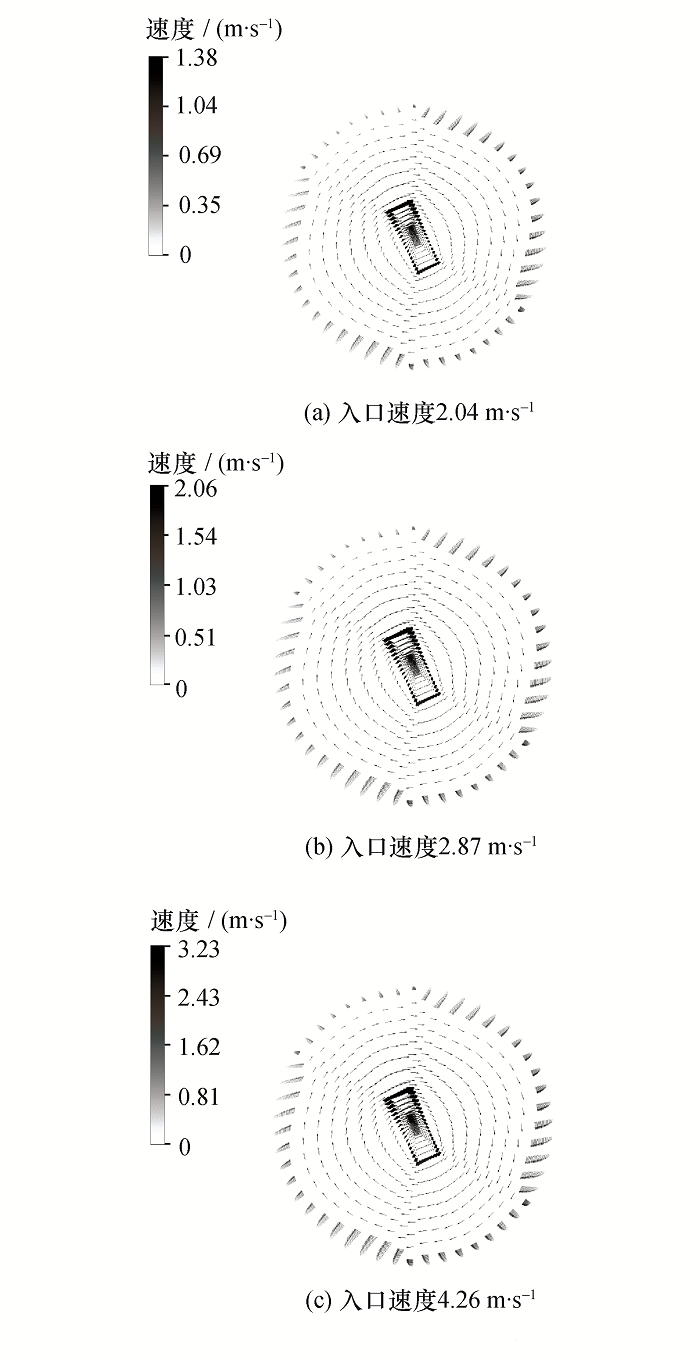 观测截面的半径为15.05mm, 高度为50mm, 其边界为壁面。由图8所示,观测截面上液滴湿度分布形状大致呈圆周或圆盘状(圆盘可认为由不同直径的圆周构成), 湿度分布的大小近似为中心区域小,越往外越大。此处本文模拟的特征液滴尺寸在10μm量级,流场速度在5m/s的量级,流场尺寸在0.1m量级,可估算液滴的 St数[1]为0.15, 该值小于1, 说明液滴对流场有一定跟随性。图9给出了观测截面上流场速度矢量图,由该图可知,具有相同速率的速度矢量呈圆周状分布。由于小尺寸液滴对流场的跟随性好,因此它们可以跟着流场作圆周运动。对于大尺寸液滴,虽然流场会对它们的运动产生一定影响,但它们的随流性差,不会一直跟着流场作圆周运动,而是逐渐偏离圆周轨道,最终被流场抛向壁面。所以液滴湿度呈圆周或圆盘状分布,并且中心区附近的湿度小,边界区附近的湿度大。通过上述定性分析,说明利用C&B模型得到的三维空间液滴湿度分布信息是合理的。