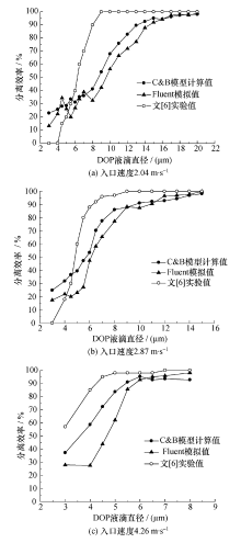流场计算完成后,再计算 DOP液滴的运动行为。 DOP液滴粘附在壁面或从下出口流出即视为被旋风分离器分离,从上出口流出的 DOP液滴将会随空气一起进入外部环境,分离效率的具体定义见(35)式。将 C&B模型计算所得的 DOP液滴在旋风分离器内分离效率的结果和实验值[6]作比较,并与利用 Ansys13 Fluent中的离散相模型( DPM模型)的计算结果对比(图7)。