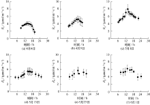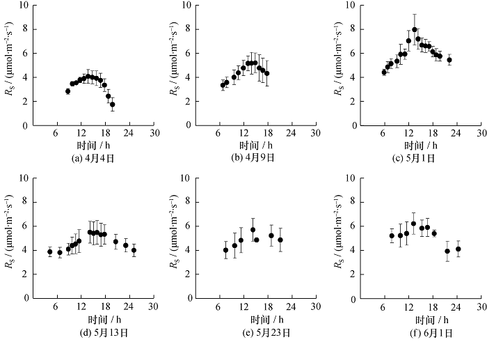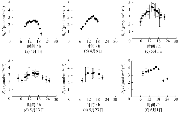 本文选取小麦典型生育期开展实验,分别为拔节期(4月4日与4月9日), 抽穗期(5月1日), 开花期(5月13日), 灌浆期(5月23日)和成熟期(6月1日)。为使实验具有代表性,本研究所选6个测量日天气均为晴朗。每个测量日内,土壤呼吸的测量时间间隔为1h或2h。
