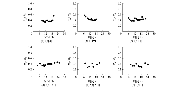 自养呼吸对总土壤呼吸的贡献率是描述土壤呼吸来源的重要参数。图5表明,除4月9日自养呼吸贡献率浮动较大外,其他测量日的自养呼吸贡献率在日内基本保持不变,但不同生育期自养呼吸的日内贡献率量值有微小差异。6个测量日的自养呼吸平均贡献率为34%、 38%、 42%、 33%、 29%和28%, 在抽穗期达到峰值。