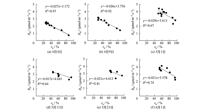 结果表明,异养呼吸与空气温度的相关关系较好,好于其与各层土壤温度相关性。4月4日的异养呼吸与温度相关性普遍较差,可能是当日测量存在较大误差。异养呼吸与空气相对湿度 rh存在较好的负相关关系[13], 见图6。