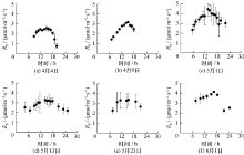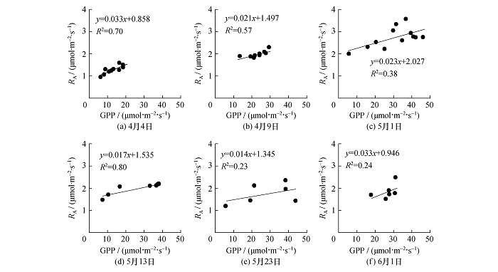 本研究通过相关关系分析发现,在6个测量日内,自养呼吸分别与其1h、 2h、 3h、 4.5h、 4h和 2h 前的GPP有最好的相关性,其对应的相关关系见图7, 因此可以认为土壤呼吸分别滞后GPP相应的时间。进一步表明滞后时间受作物高度影响,这与先前的研究结果一致[16]。因此从拔节期到开花期,滞后时间逐渐升高。开花期后该滞后时间下降可能受实验误差以及相关关系分析不确定性的影响。在日内尺度上,自养呼吸与空气温度、土壤温度和相对湿度均无显著相关性(数据未列出)。
