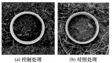 为将总土壤呼吸区分为异养呼吸和自养呼吸,本文采用简单易行的根系排除法[10]。其基本原理是: 设计对比实验,分别观测有根处理和无根处理的土壤呼吸(见图1)。有根处理的土壤呼吸为总土壤呼吸,无根处理的土壤呼吸为异养呼吸,二者之差为自养呼吸,即植物根系释放的CO2。实验具体实施方案如下: 于小麦播种前,在田内随机选取一块 4m×4m的范围,该范围内不播种,作为控制组(测量异养呼吸,图1a), 在选定范围中心安装土壤呼吸测量用的聚氯乙烯PVC扣环(内径10cm, 长 12cm), PVC扣环插入土内9cm, 其上沿高出地面3cm; 同时在附近的播种区内选择对照组(测量总土壤呼吸,图1b), 对照组的聚氯乙烯PVC安装于小麦两垄之间,安装深度与控制组相同。因为控制组无小麦枝株,因此为使得控制组样方具有与对照组样方相似的光照条件,采用遮光网对控制组进行遮荫处理。为降低空间变异性对实验产生的误差,本研究控制组和对照组各取3个重复,每个重复测量3次。测量土壤呼吸所用仪器为便携式土壤呼吸测量系统LI-8100(LI-COR Inc., Lincoln, USA), 该系统属动态气室法[3]。
