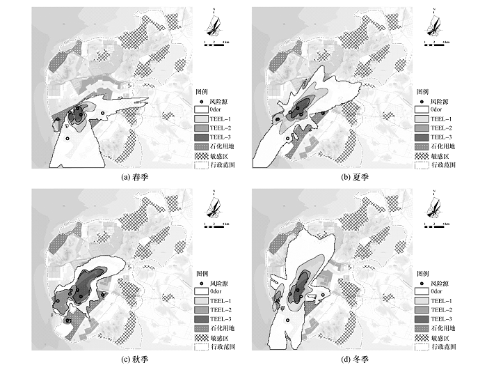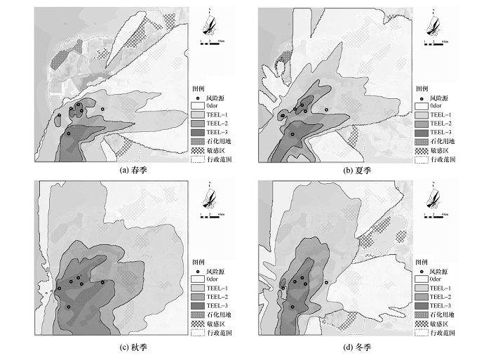 从图2看出,评价区域春、夏、冬三季气象条件较利于事故后的扩散,秋季气象条件不利于气体扩散。春、夏季大气风险场对石化园区东侧敏感区造成了一定程度的影响,冬季风险场避开了主要人口密集区,风险影响相对较低; 秋季事故性风险场影响区域面积远超其他三季,与石化园区距离最近的东侧、东南侧居住区风险过高。