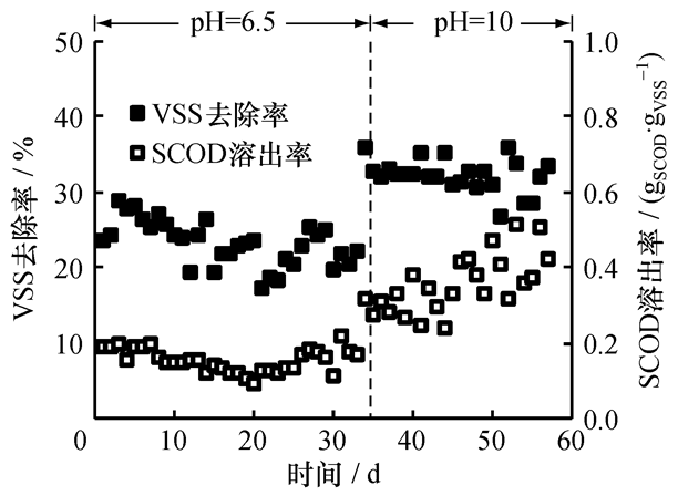 由前述结果可知,高浓度污泥水解时,有机物溶出率较低,因此在含固率为5%污泥的热水解试验中投加氢氧化钠,考察加碱对污泥热水解的促进效果。苑红英[23]等的研究表明, pH为10可提高污泥上清液中挥发性脂肪酸VFA浓度,利于后续厌氧消化的进行。欧阳云凤[24]研究表明, pH值过高会造成蛋白质水解过度,不利于后续厌氧消化过程对有机物的利用。本试验综合考虑成本后,在HRT为 1d、 温度54~60℃时,调节初始pH值为10左右进行水解。由图4可以看出,投加氢氧化钠后,污泥的VSS去除率和有机物溶出率分别由21.96%和0.18gCOD/gVSS增加到32.24%和0.36gCOD/gVSS, 分别增加了46.8%和100%,水解效果明显提高,说明加碱可以有效促进污泥水解。