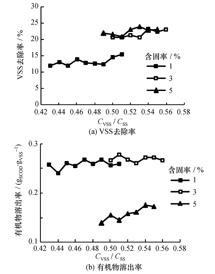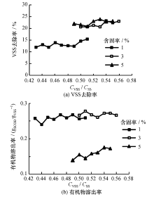 中国污泥的机物质量比低,是厌氧产气低的主要原因之一,因此也研究了有机物质量比的影响。试验所用剩余污泥的 CVSS/ CSS在0.43~0.56之间波动。图5给出了HRT为1d、 温度为54~60℃时,不同含固率污泥低温热水解效果随有机物质量比的变化情况。结果表明, VSS去除率随着有机物质量比的增加而有所增加; 污泥含固率5%时,有机物溶出率随有机物质量比的增加而增加,其它含固率下有机物溶出率变化不明显。