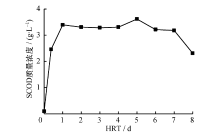 剩余污泥的初始溶解性COD(soluble chemical oxygen demand, SCOD)的质量浓度为100mg/L、 COD的质量浓度为25 250mg/L、 有机物质量比 CVSS/ CSS为0.48, 水解温度55℃。低温热水解1d时, SCOD的质量浓度可以达到较高水平,试验结果见图1。当HRT小于等于1d时, SCOD的质量浓度随时间延长而增加, 1d时达到3 394mg/L, 说明剩余污泥中的难溶性有机物被水解酸化菌分解为可溶性物质,上清液中SCOD的质量浓度迅速上升。1d后随时间延长, SCOD的质量浓度不再明显增加,原因有: