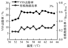 温度升高可有效加快反应速率。图2表示了HRT为1d、 污泥含固率为3%、 CVSS/ CSS为0.51~0.56的情况下,温度50~65℃对污泥热水解的影响。有机物溶出率定义为单位质量污泥溶解出的有机物的量,由于初始SCOD质量浓度较低,可以用SCOD质量浓度与污泥中有机物的质量浓度比表示。试验结果表明, 50~53℃时污泥的VSS去除率和有机物溶出率较低,平均为17.24%和0.17gCOD/gVSS, 超过54℃后VSS去除率和有机物溶出率显著增加。54~65℃时, VSS去除率和有机物溶出率相对平稳,平均值分别为22.31%和0.26gCOD/gVSS。Rocher[20]研究表明, 55 ℃污泥细胞开始失活, 60℃时细胞失活时间仅需2min。Neyens[21]发现当温度高于60℃, 微生物的细胞壁即可被破坏。Ge[22]等研究表明,预处理温度从50℃增加到60℃和65℃时, VSS去除率并未提高,与本试验结果一致。综合考虑污泥溶出效果与运行成本,中试的反应温度控制在54~60℃内。