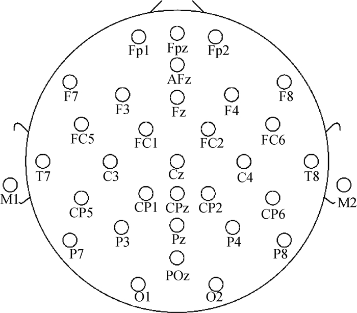 脑电信号采集采用ANT公司生产的EegoTM mylab 64 NeuronEEG记录分析系统。本实验采集32导EEG数据,采样率为1 000 Hz。被试进行注意力广度任务测试时同步采集脑电信号。电极放置位置基于国际10—20系统如图 1所示,接地电极位为AFz,在线参考电极为CPz。所有电极阻抗保持在5 kΩ以下。记录的EEG数据,采用基于MATLAB运行环境的EEGLAB Toolbox进行预处理,选用全导联平均作为参考。首先,为消除环境噪声,利用带通FIR滤波器滤波(高通0.5 Hz,低通45 Hz)。为了计算更稳定可靠的脑电特征参数,计算上采取叠加平均的方法。在字符串的字元数N设定为3~9下,即有7个级别,每个级别下有30道题。在每一道题中取一段脑电数据,每位被试者共提取了210个EEG数据段。