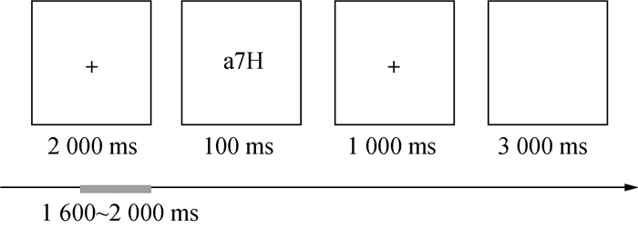 被试者接受tDCS刺激后,摘除电极片。脑电采集准备工作需要约5 min,完成后随即执行注意力广度任务。在本研究中,注意力广度中的视觉元素以字符串的字元表示,使用的注意力广度任务参考了Sternberg范式研究,并加以修改以实现EEG记录与方便后续的分析[14-15]。在注意力广度任务中,字符串会显示在计算器屏幕上,字符串由数字0~9,大写字母A~Z和小写字母a~z随机构成,使用白色背景与黑色字体。被试需要判断字符串包含的字元数。本实验难度N(字符串个数)设定为3~9,随着字符串个数N增加,难度也随之上升。在难度N级中,会出现3种字元数的字符串,包括NN-1和N+1,分别以50%、25%和25%的概率出现。被试者要判断出现的字符串的字元数量是否为N,并用右手按下‘J’键表示‘是’或用左手按下‘F’键表示‘否’。实验流程如图 2所示,每次试题开始,首先呈现2 000 ms固定“十”字,然后呈现100 ms的字符串,随后呈现第2个固定“十”字提示被试作答。如果参与者在1 000 ms的限制内没有回答,则会被视为给出了错误的答案,即2 100 ms的题目测试时间,以及3 000 ms的题目间隔,在每个难度下循环30次。为了测试被试者注意力所能判断的目标数量以及便于受试者清楚理解题目指示,测试难度设定为由3~9依序渐增。每个难度级别结束时,参与者可以自行决定进入下个难度前的休息时间。测试任务过程中,记录被试者的作答记录和反应时间。