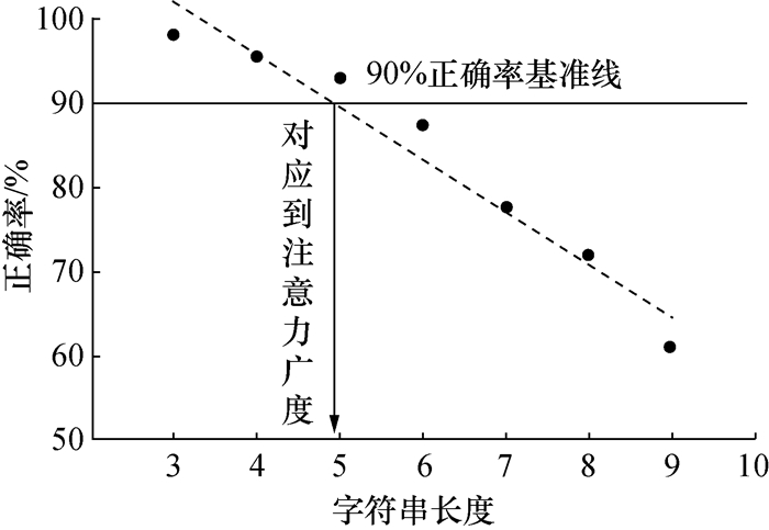 以每个被试者的作答纪录,分别计算出在7个难度下的正确率,对应每个难度下字符串的字元数,做一次线性回归。取90%正确率为基线,所对应到字符串的字元数,即为被试者的注意力广度评估指标。计算方式如图 3所示,图中数据点为所有人在所有状态下的平均正确率。