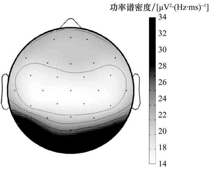 取1 600~2 000 ms时间段数据,计算所有导联Alpha波功率,可以得到脑地形图如图 5所示。图中显示,在接受刺激前的准备状态,脑地形图中额叶(Fp1、Fpz、Fp2)、颞叶(T7、T8)、枕叶(O1、O2)皆呈现出较高的Alpha波功率,其中以枕叶功率最高。运动感觉区(C3、C4)有较低的Alpha波功率。