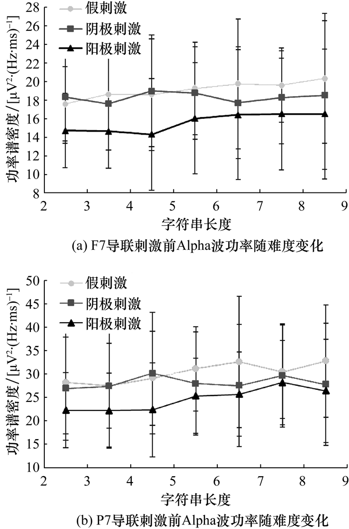 通过计算刺激前Alpha波功率可以看到,阳极刺激组与假刺激组相比,其功率较低。以F7、P7导联位置为例,电刺激条件下的刺激前Alpha波功率随难度变化如图 6所示。图中显示,随着难度增加,刺激前Alpha波功率会随之上升,但接受阳极刺激后其功率会较低。当受试所接受的注意力广度任务字符串长度为3~5时,刺激前Alpha波功率下降更为显著。阴极刺激组则无明显下降。