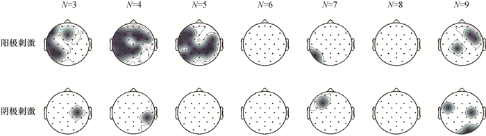 在阳极刺激和阴极刺激条件下,刺激前Alpha波功率随注意力广度任务难度增加而上升。阴极与阳极刺激条件下刺激前Alpha波功率显著降低位置分布如图 7所示。图中显示,不同难度对脑电信号具有不同程度影响,在字符宽度为3~5时,阳极刺激组上多处导联位置的刺激前Alpha波功率出现显著下降,阴极刺激组则无此现象。且随着难度提升至字符宽度为6以上时,在2个刺激组上都无法观察到显著下降的情形。如同前文所提及,刺激前Alpha波功率与被试者的注意力情形高度相关,在徐慈妤等[29]的研究中,发现注意力低的被试组可以通过tDCS降低其刺激前Alpha波功率,进而提升其认知任务的表现。其研究与本研究所观察到的现象一致,说明tDCS提升注意力广度的可能机理也是通过降低刺激前Alpha波功率。假刺激控制组中平均注意力广度为5,当字符宽度为6以上时,由于已经超过被试者的注意力广度,无法看到刺激前Alpha波功率的显著下降。又因为tDCS使用的海绵电极面积较大(面积为39 cm2),且将阴极贴置于对侧,当电流通过大脑时可以同时影响到多处脑区,结果如图 7所示。