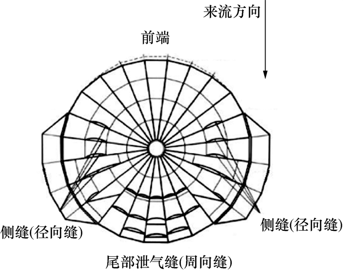 为了使降落伞兼具减速、承载大、可横向运动等特点,针对简单降落伞的改进研究一直在进行。其中,在低速圆伞的改进方案中,最成功的是Para-Commander降落伞[4],该降落伞设计的关键是简单地在圆伞上开径向和横向的孔、缝。根据分析,该降落伞原理如图 1所示,径向的缝具有控制水平面内旋转的能力;周向孔、缝具有稳定飞行、使伞横向运动的作用;顶孔可以减小伞顶端压力、泄压、有效防止伞撕裂,同时可以使伞内顶部不产生横向涡,稳定伞内流场、使降落伞平稳下落。开缝设计可以使降落伞结合圆伞的优点,独特的开缝结构为降落伞提供了更好的稳定性、经济性和滑翔性能。但是,降落伞空投实验价格高昂、实验次数有限[5],Para-Commander降落伞只经过实际经验改进,且受到织物缝合的限制,具体设计尺寸、开缝位置没有经过精确数值模拟计算、调整,性能还有较大的提升空间。