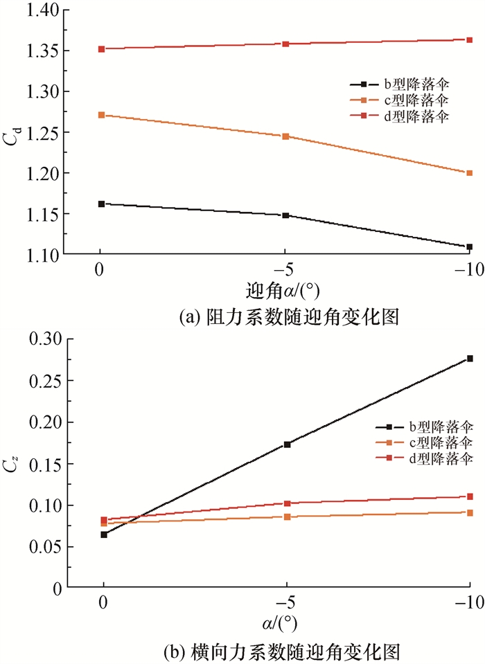 将a型、b型、c型和d型降落伞性能对比可知,阻力系数约分别为1.23、1.11~1.163、1.201~1.271、1.352~1.363,其中,d型伞阻力系数最大,减速性能最好且随迎角变化飞行最稳定。各伞型的横向力系数分别约为0、0.06~0.027、0.078~0.091、0.082~0.11。尽管b型伞阻力系数在-5°和-10°迎角时大于其他2种伞型,但是其变化剧烈容易造成伞衣的撕裂;而d型伞阻力系数最大,横向力系数较大且两者均变化幅度最小,其平飞效果稳定。因此,d型伞的综合性能最佳、飞行稳定性最好。