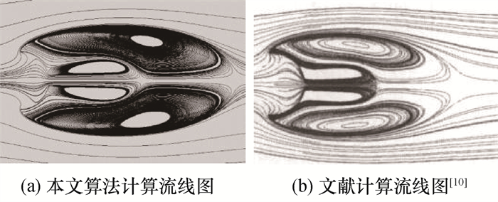为验证本文中使用的算法,选择文[10]中降落伞模型为对象,模型参数及定义如上段所述。图 2为本数值模拟结果与文[10]结果的对比,流线分布均为伞后顶孔形成的两小涡与伞底卷起两大涡,流场结构非常相似,且本文计算所得模型阻力35 N与文献中的39.11 N误差为4.6%,在可接受范围内,因此可以认为本研究数值模拟方法适用。