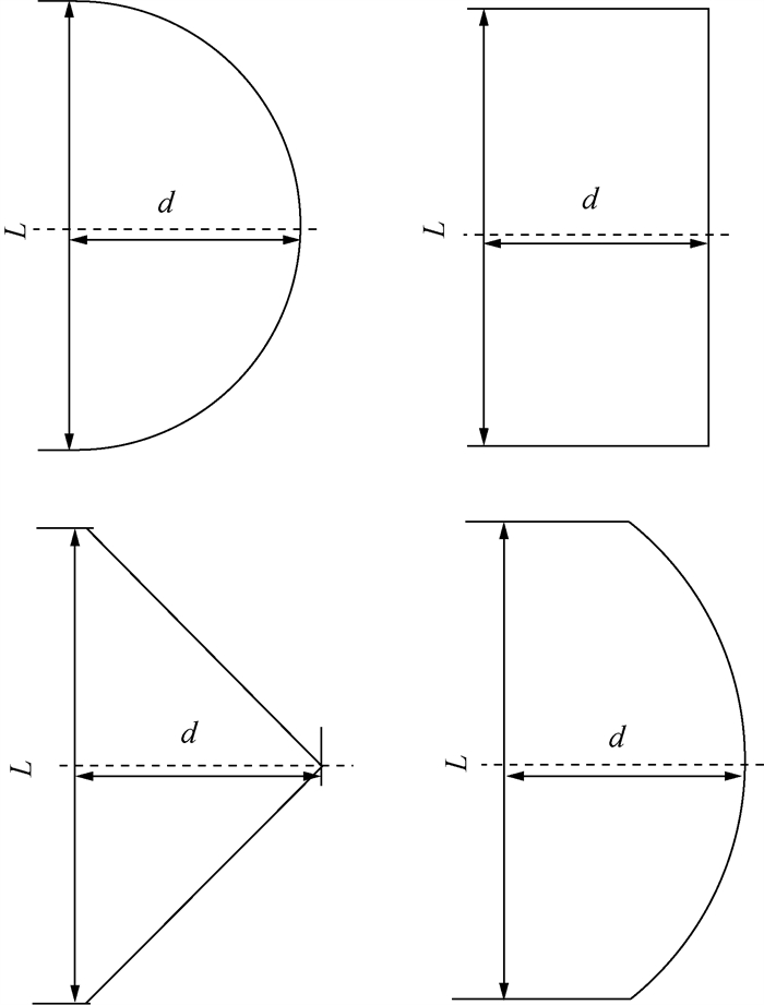 在对降落伞进行开孔、缝设计前,本研究首先对未充气时4种不同侧视几何外形降落伞的气动特性进行分析,以确定基伞的几何外形。从简单和效率角度,这里仅进行二维模型的仿真计算并比较。为表述方便,4种模型分别命名A、B、C、D,保证4种模型的投影长度L相同,底部直径L=0.2 m,伞深d=0.1 m,厚度0.001 m,伞截面几何形状如图 3所示,计算时所设置的来流条件为:来流速度10 m·s-1,Re 1.5×105,来流静压101 325 Pa。