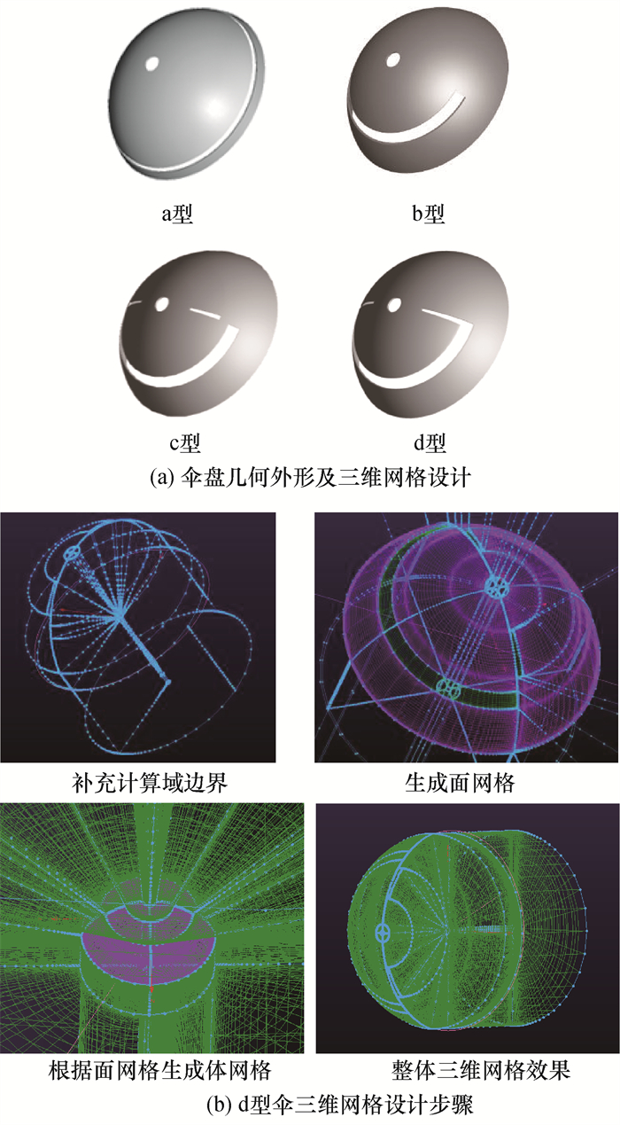 值得注意的是,b、c、d降落伞模型均为非对称模型,在进行三维网格划分时,首先通过建立降落伞的三维模型,将模型数据导入模拟的前处理软件进行网格划分。需要说明的是,在网格制作过程中,按照如图 4b所示步骤:首先补充绘制计算域的二维边界线,随后在降落伞所有的二维边界线上布点,然后将同曲面上处于对边的点连接生成二维面网格,最后在面网格的基础上将面网格连接生成三维网格,用三维网格填充整个除降落伞模型以外的计算域,同时加密降落伞模型附近的网格。