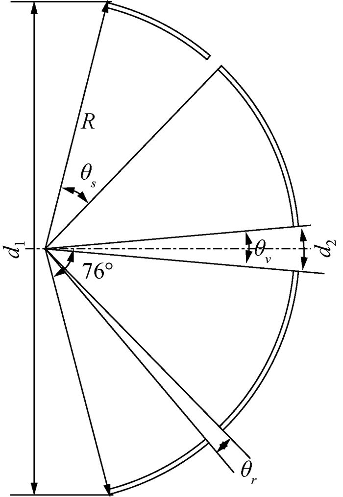 2.3 模型尺寸本研究建模使用的降落伞尺寸参考了后期实验用降落伞尺寸。降落伞对称面几何外形如图 5所示,未开环缝的降落伞基伞几何参数列于表 2,降落伞的开孔、缝位置分布用弧长对应圆心角θv、θs、θr表示其位置、大小(见图 5)。其中,降落伞顶孔与伞底边直径的比值采用美军F-111飞行员逃生模型(F-111 aircraft crew escape module)的降落伞数值[11],该数值经过实验验证并最终被应用于实际军事训练,且F-111降落伞的工作环境与本文实验设计相似,因此具有一定参考价值。