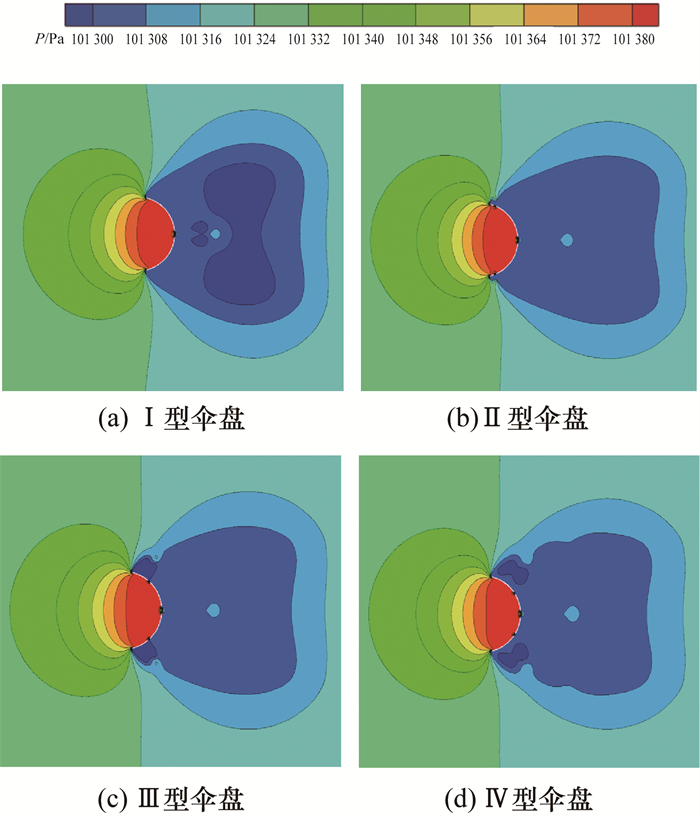 4种伞盘模型数值模拟所得压强云图如图 6,从图中可以看出,不同伞盘的伞前压力分布基本相同,但伞内高压区面积大小为Ⅰ>Ⅱ>Ⅲ>Ⅳ,也可以反映4种伞盘的阻力系数,这是由于Ⅱ、Ⅲ、Ⅳ 3种伞盘在开顶孔的基础上增加了距顶孔不同位置的环缝,高压气流从环缝泄出,环缝越靠近顶孔气流越容易泄出。观察伞后低压区,伞底与环缝之间压强最低,环缝对伞后大范围的低压区产生影响,且环缝越靠近顶孔影响越大。