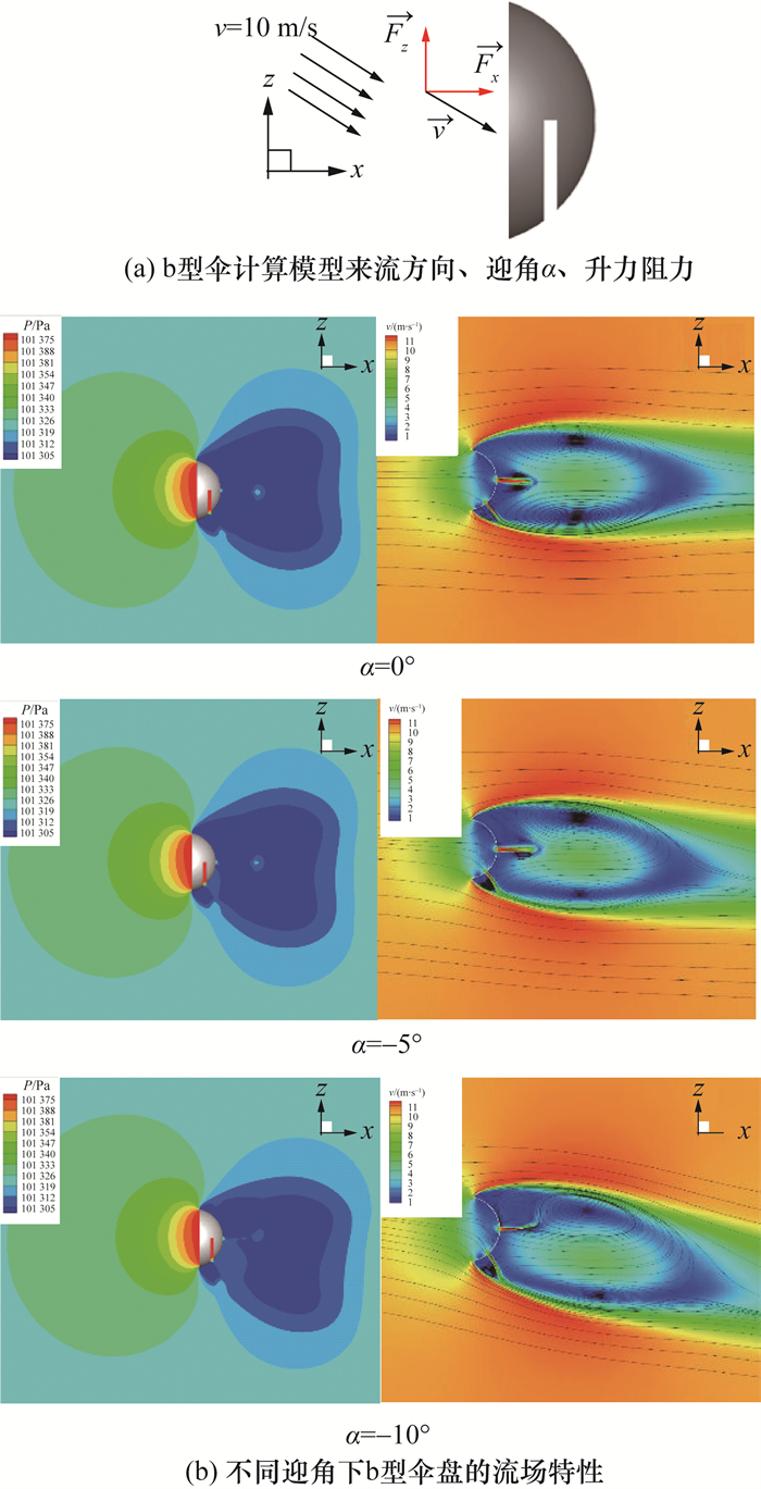 根据数值模拟结果对模型子午线截面(即xz平面)的流场特性进行分析。因b型伞具有较大横向力可以获得向前运动的能力,但同时也可能降低其稳定性,本研究设置不同的来流方向,观察及分析流场、阻力及横向力的变化,研究在合适迎角情况下,伞盘的稳定性是否会改善。本研究为设置方便,在数值模拟中改变来流方向实现伞盘迎角的变化,来流方向设为与x轴正向的夹角,分别为0°、-5°、-10°,具体如图 7a所示,来流速度仍为10 m/s。
